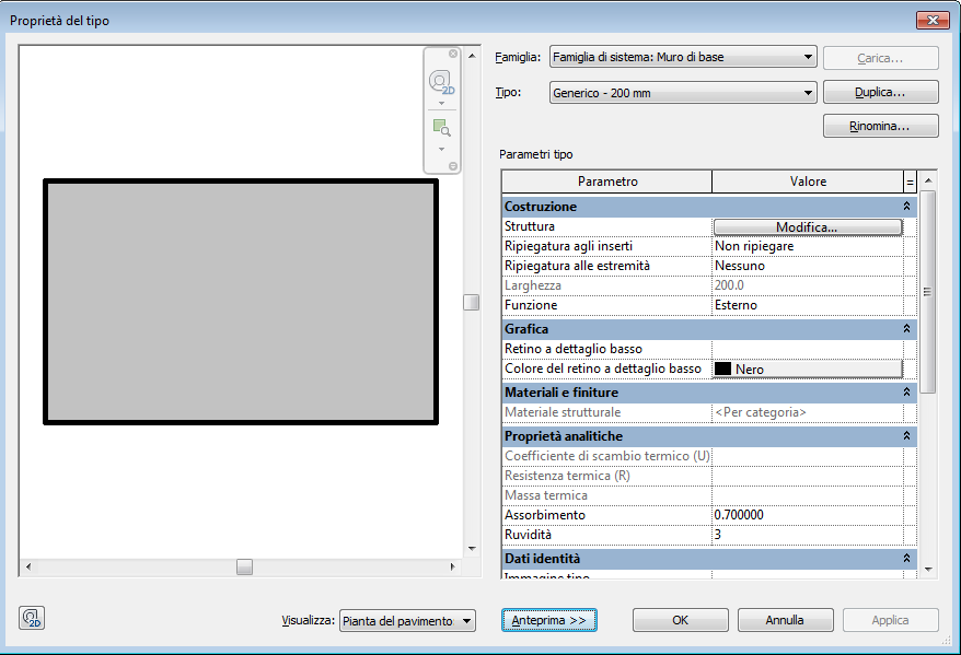 Di seguito è raffigurato un esempio di finestra di dialogo Proprietà del tipo relativa ad un tipo di muro, con il riquadro Anteprima visualizzato.