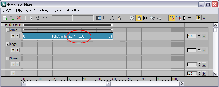 ミキサー内でクリップの長さを変更することによって、モーションのスピードを変えることができます。クリップを長くするとモーションが遅くなり、短くすると速くなります。