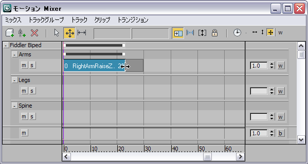 モーション Mixer では、トラック表示内でインタラクティブにクリップを短くしたりクリップのタイミングを変更できます。