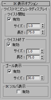 このロールアウトのオプションでは、ツイスト マニピュレータと IK チェーン オブジェクトの表示方法を設定します。