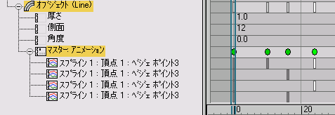 ドープ シート モードの場合、[トラック ビュー](Track View)内では、マスター ポイント コントローラは緑色のキーを持つトラックとして表示されます。 マスター トラックの下位に位置するサブトラックには、アニメートされた頂点やコントロール ポイント、およびベクトルがすべて含まれています。