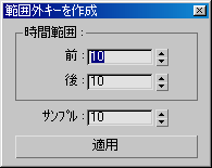 キーを生成する範囲前フレーム数を指定します。上記の例では、この編集ボックスを 20 に設定すると 10 ~ 30 のフレームにキーが生成されます。0 に設定すると、範囲の前にはキーは生成されません。
