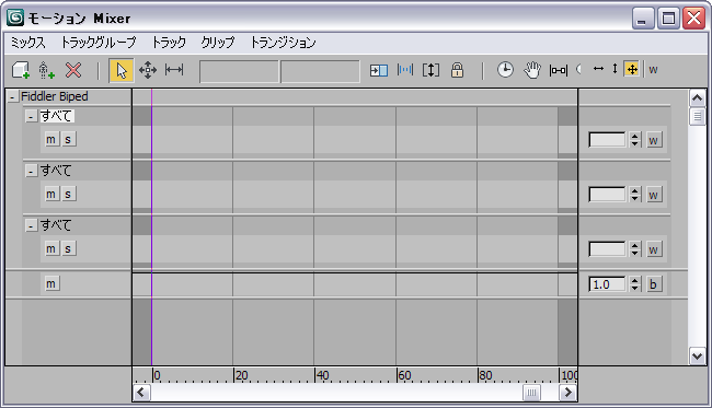 モーション Mixer 内の各トラックは、トラックグループの一部です。各トラックグループをフィルタリングして、1 セットのボディ パーツのモーションのみを使用し、他のボディ パーツのモーションは使用しないようにすることができます。たとえば、あるモーション ファイルからの腕のモーションを使用し、別のモーション ファイルからの脚のモーションを使用できます。この場合は、2 つのトラックグループが必要になります。