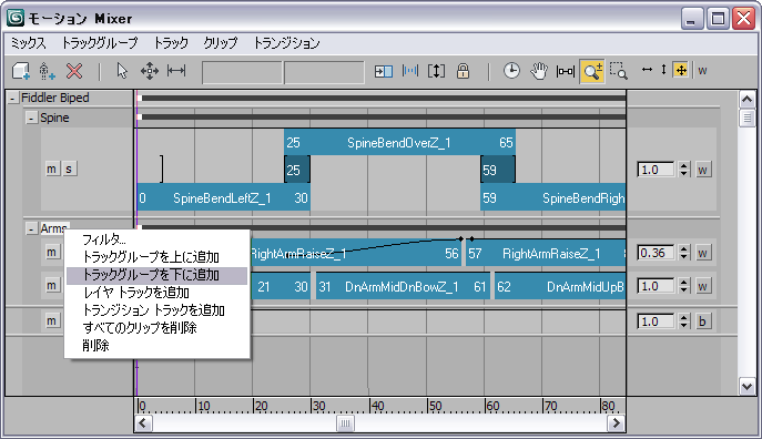 トラックグループを作成すると、既定値でレイヤ トラックが 1 つ割り当てられます。ただし、各トラックグループにはトラックを追加できるので、ボディ パーツのセットごとにモーションをミックスできます。たとえば、腕用のトラックグループを作成し、このトラックグループ内にトラックを 2 つ作成できます。その後で、各トラックに、まったく異なる 2 つのモーション セットを配置し、重み付けを使用して、一方のトラックまたは他方のトラックをモーション中の異なるタイミングで使用できます。「トラック ウェイトの調整」を参照してください。