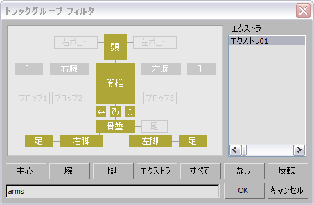 [フィルタ](Filter)を選択します。 3ds Max によって[トラックグループ フィルタ](Trackgroup Filter)ダイアログ ボックスが開きます。既定値では、すべてのボディ パーツが選択されています。