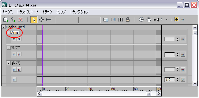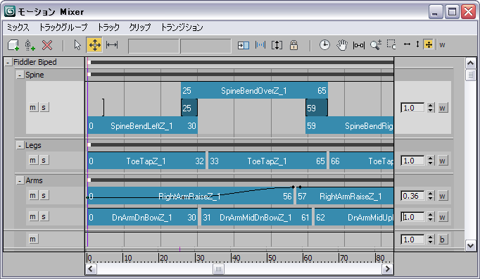 Spine (脊髄)、Legs (脚)、Arms (腕)のトラックグループ。腕のトラックグループには 2 つのトラックがあります。