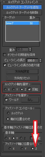 ターゲットの方向を向く軸を定義します。[X]、[Y]、[Z]のチェック ボックスは、コンストレイントされたオブジェクトのローカル座標系をそれぞれ表します。 [反転](Flip)チェック ボックスは、ローカル軸の方向を反転します。