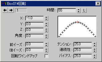 TCB コントローラはベジェ コントローラと同様、カーブを基にアニメーションを生成します。しかし、TCB コントローラは接線の種類や調整可能な接線ハンドルを使用しません。フィールドを使用して、テンション、連続性、バイアスの設定を調整します。