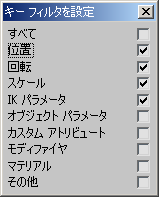 [キーを設定](Set Key)の使用時にキーが作成されるトラックを指定できる[キー フィルタを設定](Set Key Filters)ダイアログ ボックス(以下を参照)を開きます。