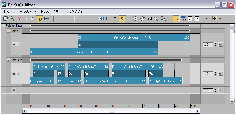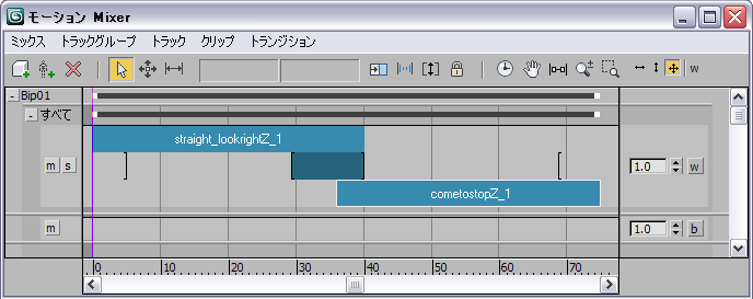 モーション フローと同様に、ミキサーでも、足ベースのモーション クリップ(IK コンストレイントによってさまざまな時点で足が接地するクリップ)間のトランジションは、アニメーションができるだけ自然になるように注意深く配置および調整する必要があります。ワークフローは、Biped をアニメートしているか、あらかじめ用意されたキャラクタなどの 3ds Max オブジェクトをアニメートしているかに依存します。