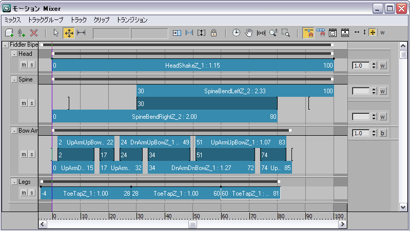 モーション Mixer でも同様の操作が可能です。オブジェクトの作成時には、それぞれに異なったモーション クリップ(BIP ファイルまたはXAF ファイル)を持つ複数のトラックをミキサーに追加できます。このとき、クリップをトリムしてモーションの一部だけを使用したり、クリップの再生速度を変更したり、クリップのトランジションを作成したりできます。