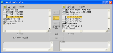例: レイヤ コントローラの出力トラックを使用して、ワイヤ パラメータを持つ 2 つのオブジェクトをリンクするには: