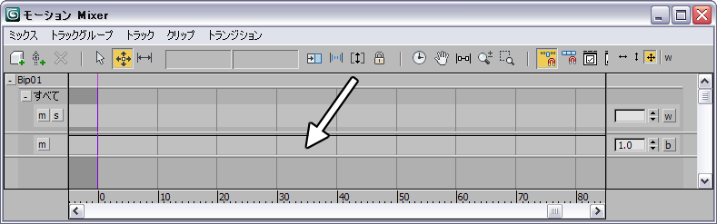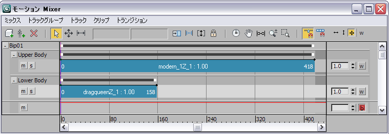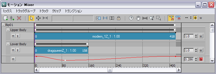 ミキサーでは、バランス トラックを使用して、自動バランス補正の度合いを制御できます。ミキサーに Biped を追加すると、バランス トラックが自動的に 1 つ作成されます。