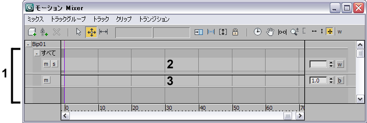 Biped を選択中にミキサーを開くと、トラックグループ、クリップ トラック、バランス トラックがその Biped に割り当てられます。Biped 以外のオブジェクトが選択されている場合は、空のミキサーが開きます。