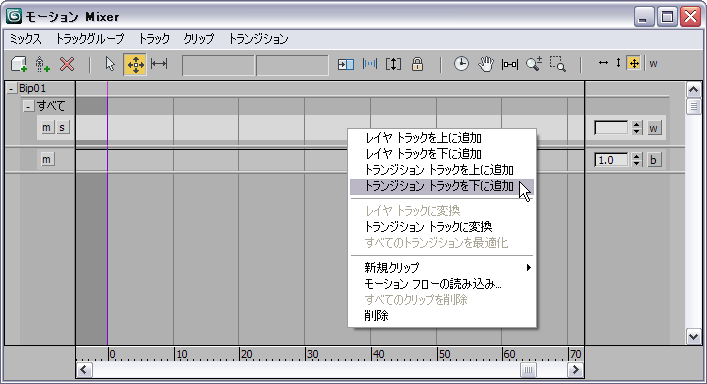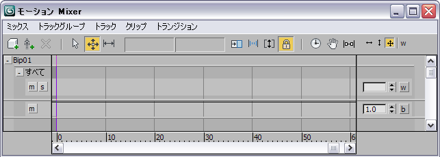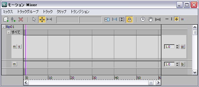 モーション間にトランジションが必要ない一連のモーションのためのトラックです。既定値では、ミキサーを開くと、Biped 用にレイヤ トラックが 1 つ作成されます。