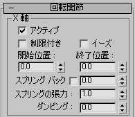 [スライディング関節](Sliding Joints)ロールアウトおよび[回転関節](Rotational Joints)ロールアウトには、位置と回転にそれぞれ類似したコントロールが含まれています。また、各ロールアウトでは X、Y、Z 軸のコントロールに同じ領域が使用されています。