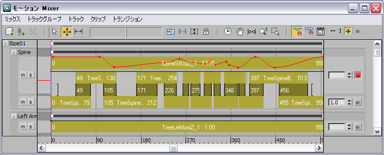 既定値では、各トラックのウェイト カーブは、トラック全体をとおして値が 1.0 に設定されます。これは、トラックのモーションがミックスに 100% 使用されることを示します。カーブを変更して値を 1.0 よりも下げると、トラック上のモーションは、その下のトラック上のモーションとミックスされます。たとえば、トラックグループ内の 2 つのトラックのウェイト カーブを 0.5 に設定すると、2 つのクリップが均等にミックスされます。