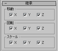 [継承](Inherit)ロールアウトでは、特定の変換を子に継承させないようにすることができます。選択したオブジェクトとその親との間の、位置、回転、スケールの各軸に対するリンクを制限できます。
