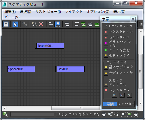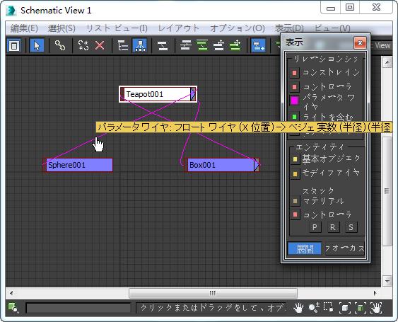 パラメータがシーン ノード内(オブジェクトに適用されるモディファイヤのパラメータに対するオブジェクトの位置など)でワイヤリングされている場合、ワイヤリングはスケマティク ビューで簡単にわからない場合があります。ただし、追加の[表示](Display)オプションを使用してワイヤリングをエクスポーズすることができます。