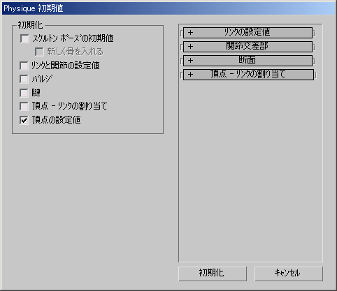 [Physique]ロールアウトで[再初期化](Reinitialize)コマンドを使用し、キャラクタのスキンの動きに対する特定のアトリビュートをリセットします。バルジのリセット、腱の削除、頂点 - リンクの割り当ての再割り当て、アタッチされたメッシュに対する Biped の位置変更などが、一般的な使用法です。基本的には、再初期化を実行すると、[初期化](Initialization)領域のいずれか 1 つまたはすべての項目がリセットされます。