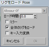 ポーズ ファイルやアニメーション ファイルをロードする際は、すべてのロード パラメータが「ライブ」になります。ロードするファイルやタイミングといった各種パラメータを変更して、ポーズをどのようにロードするかを指定できます。また、タイム スライダをスクラブしてポーズやアニメーション データのロード結果を確認した上で、[OK]をクリックして結果を適用することもできます。