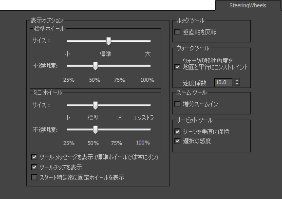 これらのコントロールは、SteeringWheels 機能を操作するときの動作に影響します。設定に加えた変更は、セッションの合間にもすべて持続します。