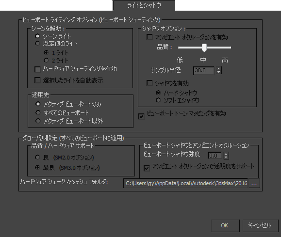 [ビューポート ライティング オプション](Viewport Lighting Options)領域の[ハードウェア シェーディングを有効](Enable Hardware Shading)がオンの場合にのみ利用可能です。