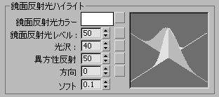 標準マテリアルの場合と同じく、この領域で値を調節すると、右に表示されているハイライト カーブが変化し、効果の状態を知る手がかりとなります。サンプル スロットのマテリアル プレビューも更新されます。