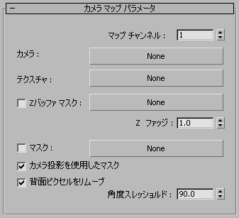 クリックして、不必要なサーフェスから投影をマスクするために使用する Z 深度データを含むマップを割り当てます。一般的には、Z チャネル オプションをオンに切り替えて同じカメラでレンダリングした RPF ファイルか RLA ファイルにします。