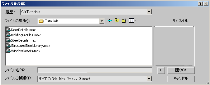 標準のファイル選択ダイアログ ボックスで、合成するシーン ファイルを選択します。MAX ファイルのみを読み込むことができます。