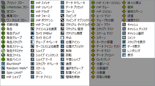 2 番目のグループは、コンテナの最後にリストされており、ここには追加のユーティリティ機能を提供するオペレータが含まれています。このオペレータには、パーティクル システムの再生を最適化する[キャッシュ](Caching)オペレータ、ビューポート内でのパーティクルの表示方法を決定する[表示](Display)オペレータ、コメントを追加するための[注](Notes)、さらに、レンダリング時の特性を指定する[レンダリング](Render)があります。