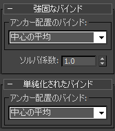 タイプを[リジッド](Rigid)または[単純化](Simplified)に設定して mParticles グルー テストを使用すると、対応するロールアウト([リジッド バインド](Rigid Binding)または[単純化されたバインド](Simplified Binding))で、バインド アンカーの配置やバインドの壊れやすさを指定できます。