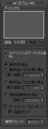- MassFX シミュレーションにおいてディフレクタとなる非パーティクル オブジェクトをリストします。これは、mParticles コリジョン テストと標準の衝突テストの大きな相違点です。ディフレクタ タイプのスペース ワープを使用する代わりに、PFlow コリジョン シェイプ(WSM)モディファイヤを適用したジオメトリ オブジェクトを指定します。[ディフレクタ](Deflectors)リストは、そのようなオブジェクトのみを含むことができます。ジオメトリ オブジェクトがPFlow コリジョン シェイプで修正されない場合、mParticles コリジョン テストのディフレクタとはみなされません。