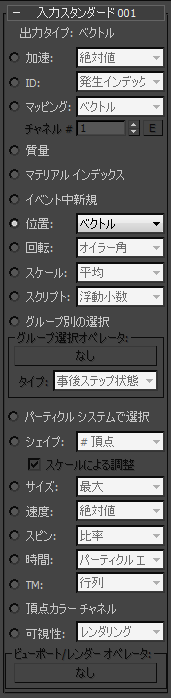 入力スタンダードは、位置、速度、スケールなどのパーティクルの標準的なプロパティを現在のパーティクル システムからコピーします。パラメータは、[プロキシ システム インデックス](Proxy System Indexing)コントロールがないことを除けば、[入力プロキシ](Input Proxy)サブオペレータと同じです。