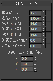 2. [根元のうねり](Frizz Root)= 50.0、[うねり X 周期](Frizz X Freq)= 14.0、[うねり Y 周期](Frizz Y Freq)= 14.0、[うねり Z 周期](Frizz Z Freq)= 14.0