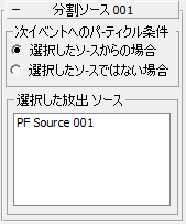 - [選択したソースからの場合](Is From Selected Source)(既定値) [選択したエミッション ソース](Selected Emission Sources)リストでハイライト表示されたソースを起源とするパーティクルがすべて、次のイベントへのリダイレクトに適格となります。