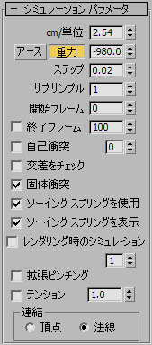 オンの場合、シミュレーションで、布オブジェクトが[重力](Gravity)の値(以下を参照)の影響を受けます。