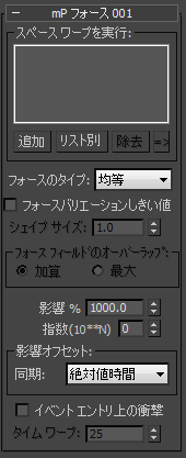 - mParticles フォースで割り当てられているスペース ワープを選択するには、リストでそのスペース ワープをハイライト表示してこのボタンをクリックします。これにより、シーンのスペース ワープが選択され、スペース ワープ パラメータへのアクセスが容易になります。