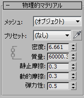 - リストからプリセットを選択し、すべての[物理的マテリアル](Physical Material)プロパティを指定します。(リジット ボディの質量は、オブジェクトの密度およびボリュームの値に基づいて再計算されます。)プリセットが選択されている場合、設定は編集できませんが、[プリセット](Preset)が[(なし)](None)に設定されている場合は値を自由に編集できます。