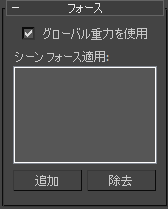 - シミュレーションでこのオブジェクトに影響を及ぼす、シーン内のフォース スペース ワープをリストします。 [追加](Add)を使用して、スペース ワープをオブジェクトに適用します。 スペース ワープによるオブジェクトへの影響を防ぐには、このリストでそのスペース ワープをハイライト表示し、[除去](Remove)をクリックします。