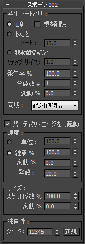 この領域内の設定を使用して、パーティクルをスポーンする頻度、使用する測定システム、およびスポーンするパーティクル数に関連する他の値を指定します。