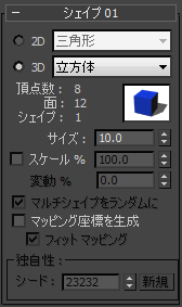 [シェイプ](Shape)で作成したプリミティブ パーティクルは、ジオメトリの中心に基点を持ちます。さらに、ローカルの 3D パーティクル スペースでの頂点位置に基づいて、UVW マップも割り当てられます。