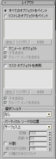 このロールアウトでは、シーン内のオブジェクトにどのようにパーティクルを配置するかを設定します。ここでの設定は、Particle Paint ヘルパーに関連付けられているすべてのパーティクル シード(既存シードおよび今後作成するシード)に適用されます。
