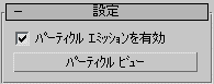 エミッタ(パーティクル ソース)アイコンの物理的な特性と、ビューポートで作成されるパーティクルとレンダリング時に作成されるパーティクルのパーセンテージを設定します。