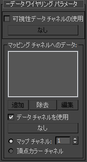 マッピング チャネルとしてデータ チャネルを追加するには、まず、[データ チャネルを使用](Use Data Channel)チェック ボックスの下にある[なし](None)ボタンをクリックして、実数またはベクトルのタイプのデータ チャネルを選択します。次に、このデータ チャネルを追加するマッピング チャネルとして、[マップ チャネル](Map Channel)(チャネル番号も設定)または[頂点カラー チャネル](Vertex Color Channel)を選択します。最後に、[追加](Add)ボタンをクリックします。