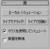 [面](Faces)サブオブジェクト ロールアウトでは、ローカルなシミュレーション時の、布オブジェクトの対話的なドラッグを有効にできます。このサブオブジェクト レベルは、布をシーン内でより対話的な方法で配置する場合に有用です。