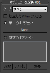 - 選択されている場合、既定で[なし](None)と表示されているボタンをクリックして、シーン内の単一の既定のオブジェクトを選択し、ビューポートでオブジェクトを選択することができます。このパラメータをエクスポーズすると、ユーザがこのボタンを使用できます。