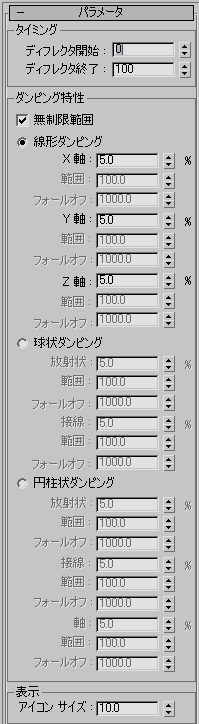 この領域では、[線形ダンピング](Linear Damping)、[球状ダンピング](Spherical Damping)、または[円柱状ダンピング](Cylindrical Damping)を選択し、同時にそれぞれのパラメータも選択します。