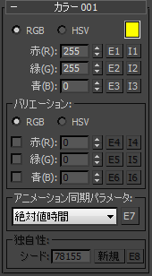 各コンポーネントには、E# または I# の形式の補助ボタンがあります。E# ボタンは、[等しい](Equal)タイプのパラメータ入力を作成します。このパラメータ入力を[パラメータ](Parameter)サブオペレータにワイヤリングできます。この方法で、同じ値を異なるサブオペレータにワイヤリングできます(単一のパラメータ サブオペレータが E タイプ入力を持つ複数のサブオペレータにワイヤリングされます)。I# ボタンは整数データ入力を定義します。この入力を使用して、個々のカラー コンポーネント値をパーティクルにワイヤリングできます。一度にアクティブ化することができるのは、I# と E# のいずれか 1 つのみです。アクティブ化すると、対応するタイプの入力が作成されます。