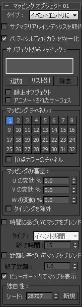 参照サーフェスから取得してパーティクルに割り当てるマッピング チャネルを選択します。マッピング チャネルは最大 32 個まで選択できます。